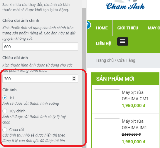 Cấu hình tỉ lệ ảnh đại diện sản phẩm: Giao diện => Tùy biến => Woocommerce => Ảnh sản phẩm